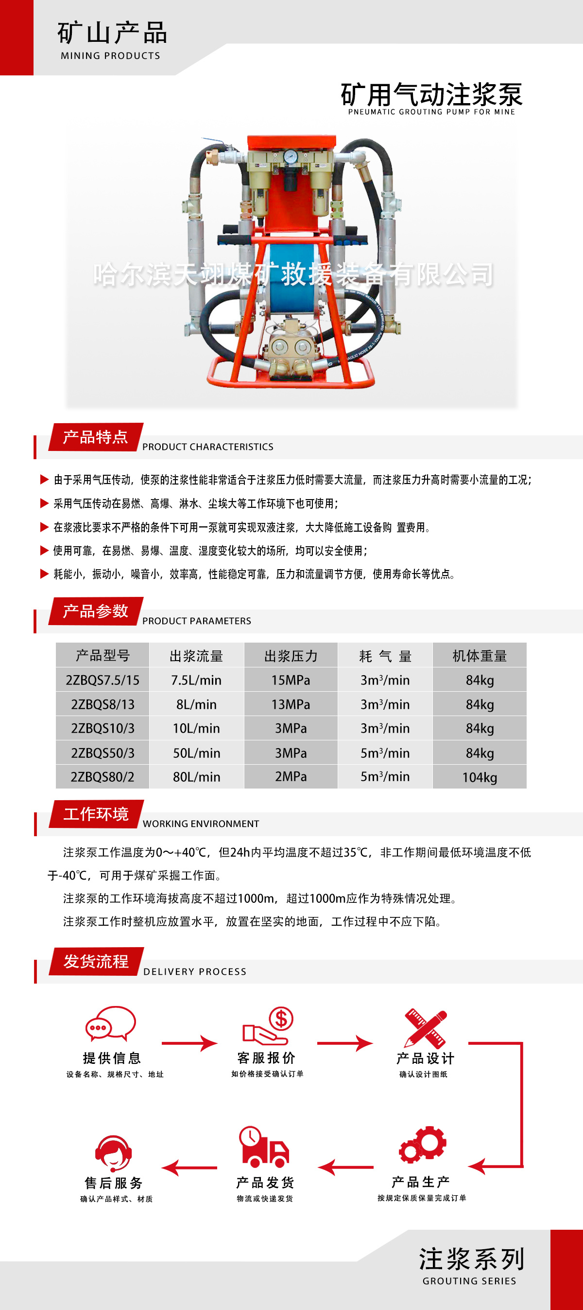 Пневматический насос для инъекционной цементации в горнодобывающей промышленности в основном используется на угольных шахтах, рудниках, в туннелях, гидротехнических сооружениях, метро, строительстве, на мостах и строительных площадках. Он применяется для гидроизоляции стенок скважин, заполнения пустот, инъекционной цементации и укрепления разрушенных горных пород, а также для инъекционной цементации анкерных канатов; используется для ремонта локальных дефектов, таких как инъекционная цементация дорожного основания автомагистралей и железных дорог, а также для обработки слабых оснований; устраняет подземные скрытые опасности во время борьбы с наводнениями и при аварийно-спасательных работах.